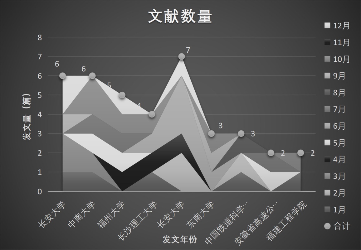 2) 依据作者合作关系图谱,其研究学者较多且存在一定的合作关系,英文文献中以Ma Wei学者为代表为最多,但也仅为4篇,中文文献中以尧俊凯学者为代表,但同样也仅仅只有4篇。中南大学土木工程学院是国内在路基大粒径回填料颗粒破碎发文量最多的机构,但发文量也仅为6篇。目前国内外路基大粒径回填料颗粒破碎研究机构已形成较成熟的合作网络,可以看出无论是理论研究层面还是设计实践层面,国内外对路基大粒径回填料颗粒破碎领域的研究呈现出一个百花齐放的态势,美中不足的是各个机构还需加强团队之间的合作。由此可以看出领域内有很多机构发表研究,但大多数均为一篇,领域内各机构相互合作较少而且近年来的研究方向也不够深入。