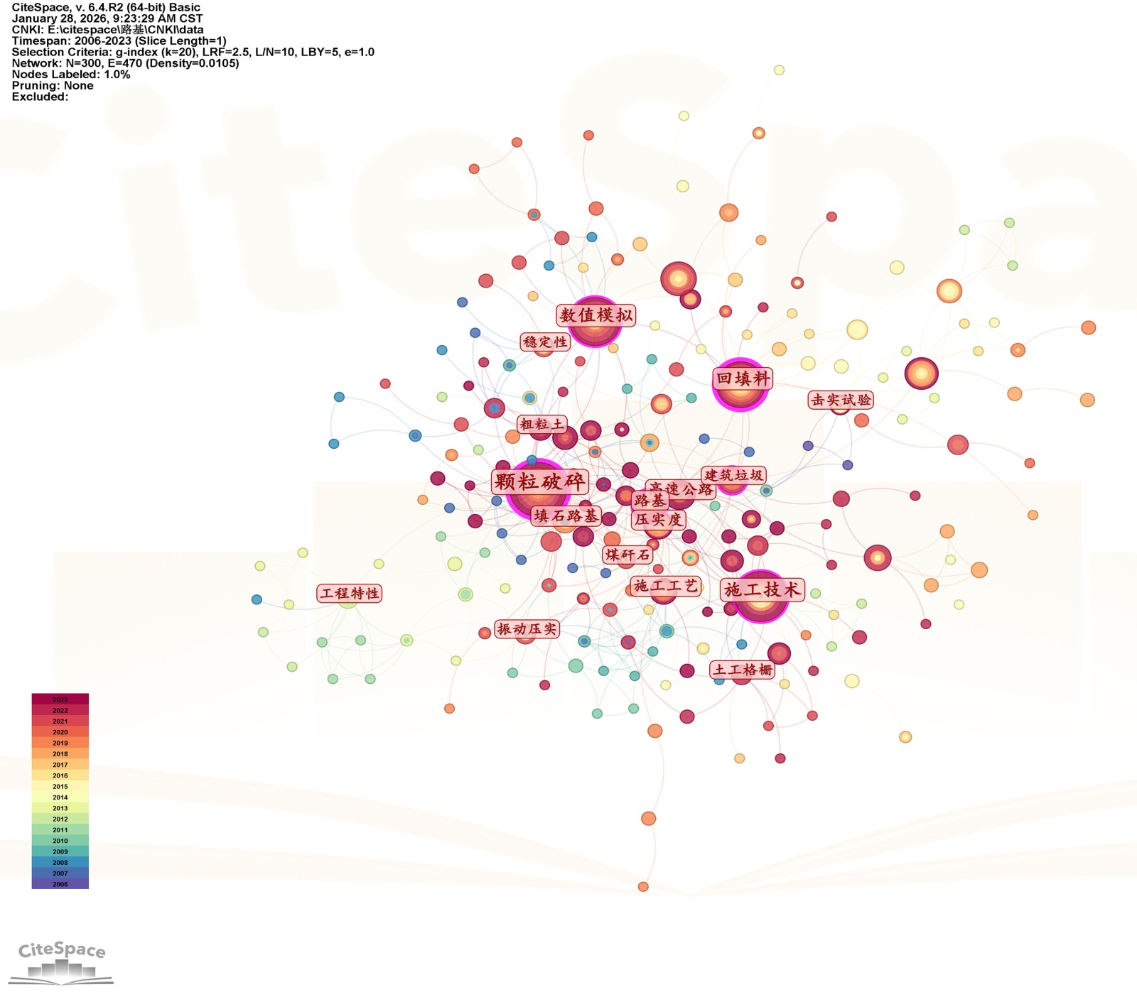 利用文献分析工具CiteSpace对国内外相关文献进行可视化分析,采用定性与定量相结合的方式,分析国内外发表的有关文献。其中CiteSpace是由美国Drexel大学陈超美教授开发的一款文献计量学可视化分析软件,是目前使用较广泛的一款文献分析软件[9]。利用空间形态的可视化方式,通过关键词共现、关键词聚类、热点词突现分析功能,可视化展现国内外路基大粒径回填料颗粒破碎领域的目前发展情况以及热门研究方向。