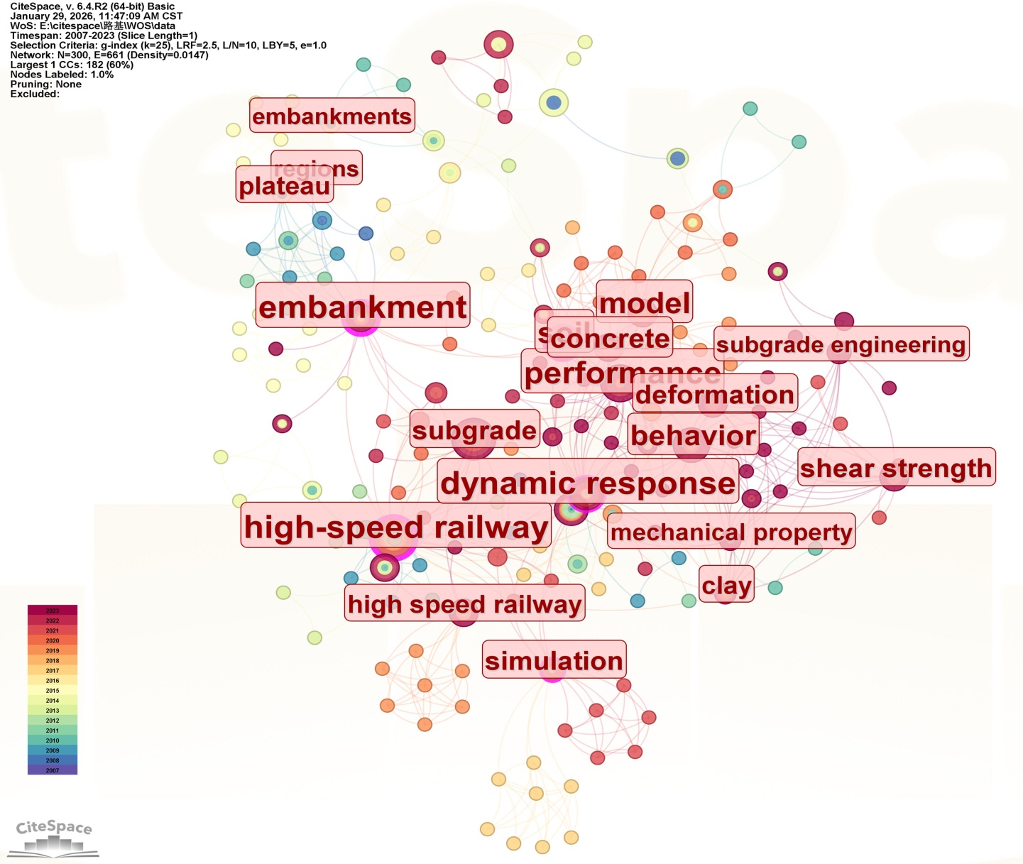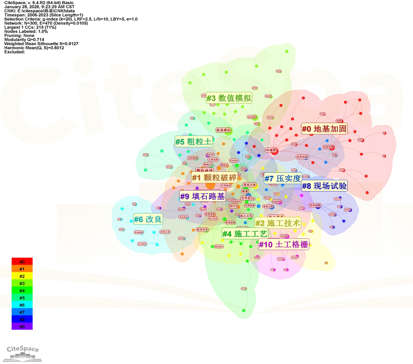 利用CiteSpace聚类分析,并以LLR对数似然算法(Log-Likelihood Ratio)为基础,以此来研究钻孔灌注桩稳定性热点研究结构紧密程度,分析研究热点。运用CiteSpace V利用快速聚类方法,得到关键词,通过阈值调整,得到图10所示的知识图谱。该图中,模块值(Modularity)为Q = 0.7935 > 0.3说明聚类结果显著,平均轮廓值(Mean)为S = 0.9257 > 0.7,说明聚类结果的可信度是非常高的[10]。图4中,Q = 0.8449 > 0.3,体现出聚类结果良好,平均轮廓值为0.9526 > 0.7,体现出该聚类结果有较高的可信度。根据图10,2007~2023路基大粒径回填料颗粒破碎学科研究可以分为图中9大聚类模块展开,然后结合聚类节点平均年份,就可以从图中体现出聚类内的学科演化过程。