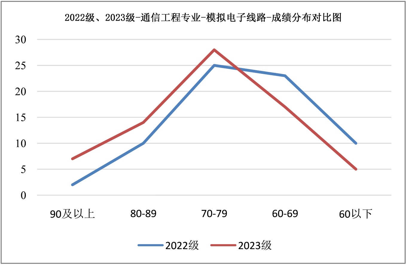 通过模拟电子线路思政融合教学改革,提升了教师的思政教学能力,实现了教学相长。通过在教学实践中渗透思政元素,使课程的教学体系更加完善,在原有理论知识的基础上,课程的育人功能得到了增强。授课中发现学生的责任意识逐渐增强,学习能力明显提高,实验过程中分析解决问题的能力有所提升,最终课程成绩也有提高,实现了知识传授与价值引领双赢。以通信工程专业为例,改革前后学生成绩对比如图1所示。可见,经过课程思政教学改革,2023级学生成绩在中、高分段人数均高于2022级,低分段和不及格学生人数均低于2022级,取得了预期的成效。