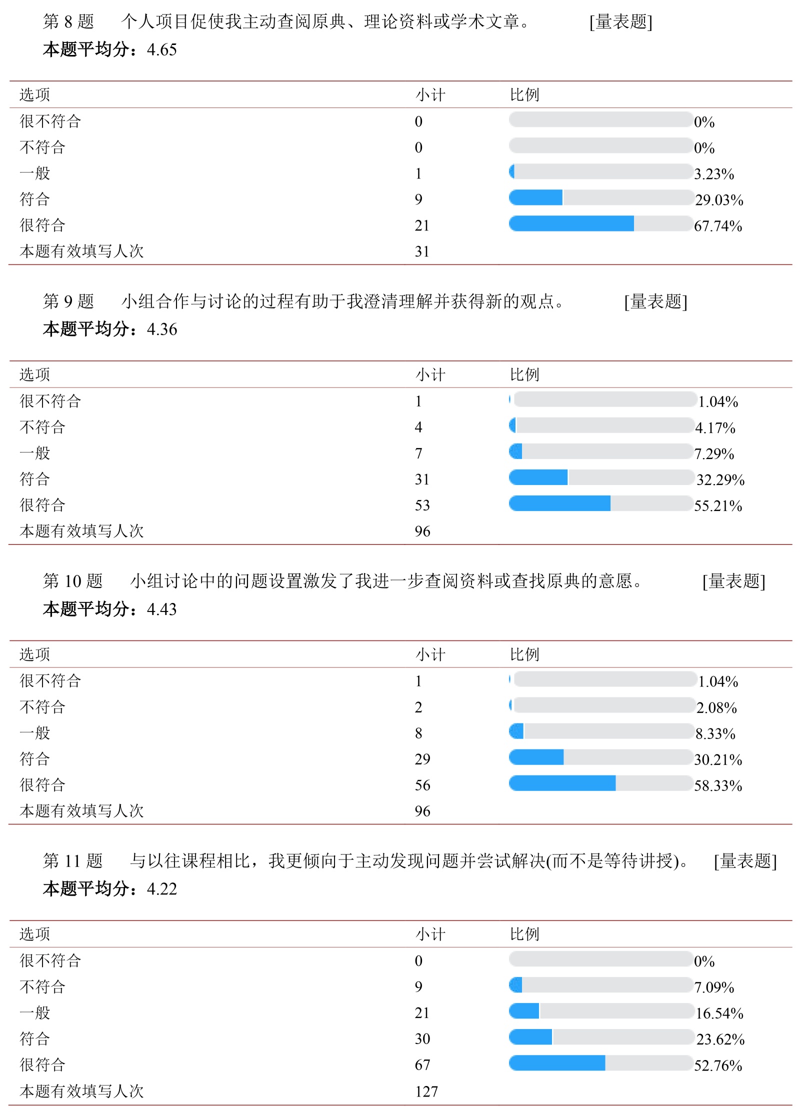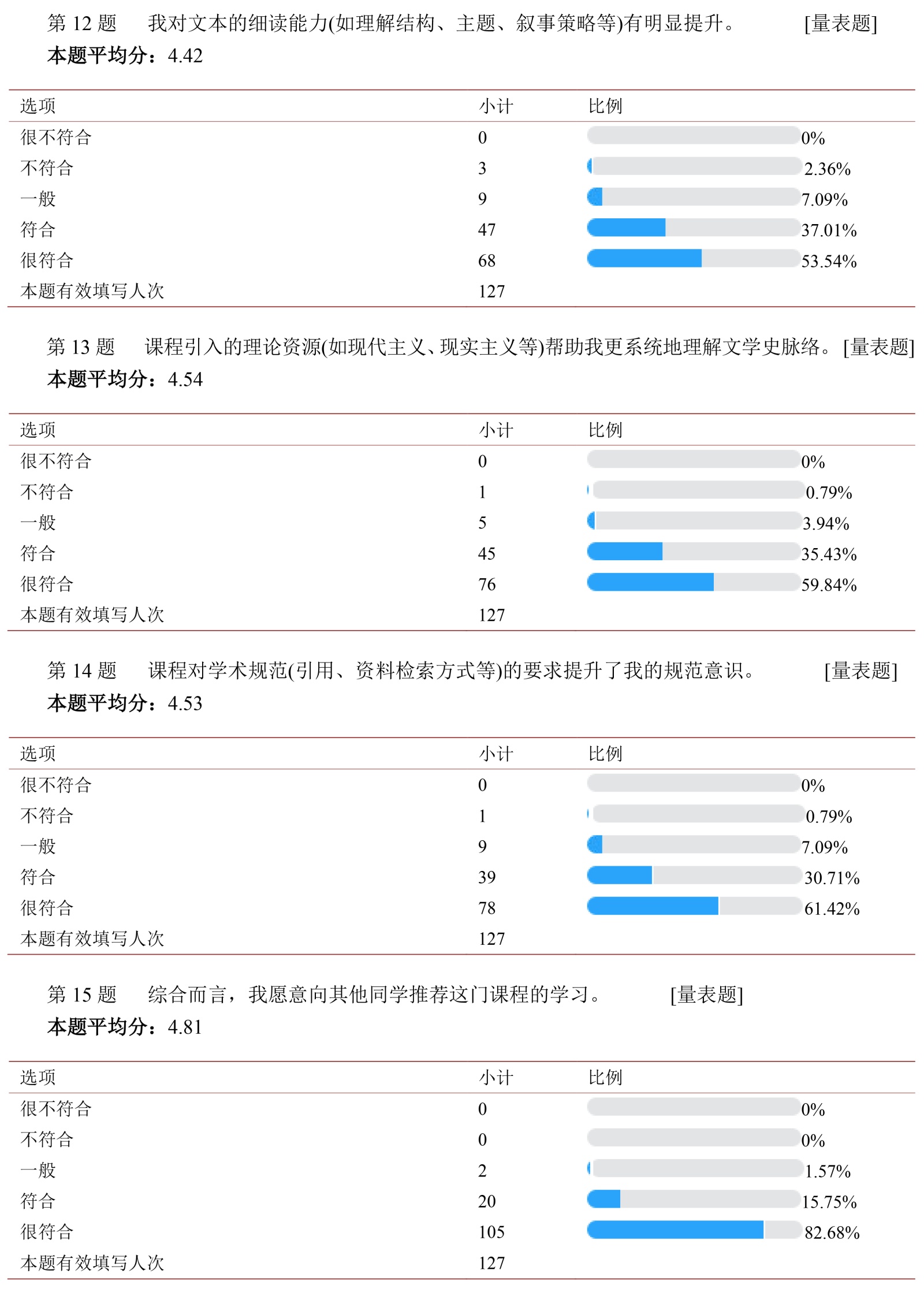 问卷设计采用李克特五点量表形式,相关题项根据课程教学目标与课堂活动特征设置,重点考察学生对课程内容理解、学习兴趣、自主学习信心、文本细读能力及理论理解能力变化的自我评估情况。需要说明的是,本问卷主要用于呈现教学改革实施后的总体趋势与学生反馈特征,属于教学实践研究中的描述性工具,而非心理测量意义上的因果检验或能力测评,其结果更多用于支持对教学效果的分析与反思。