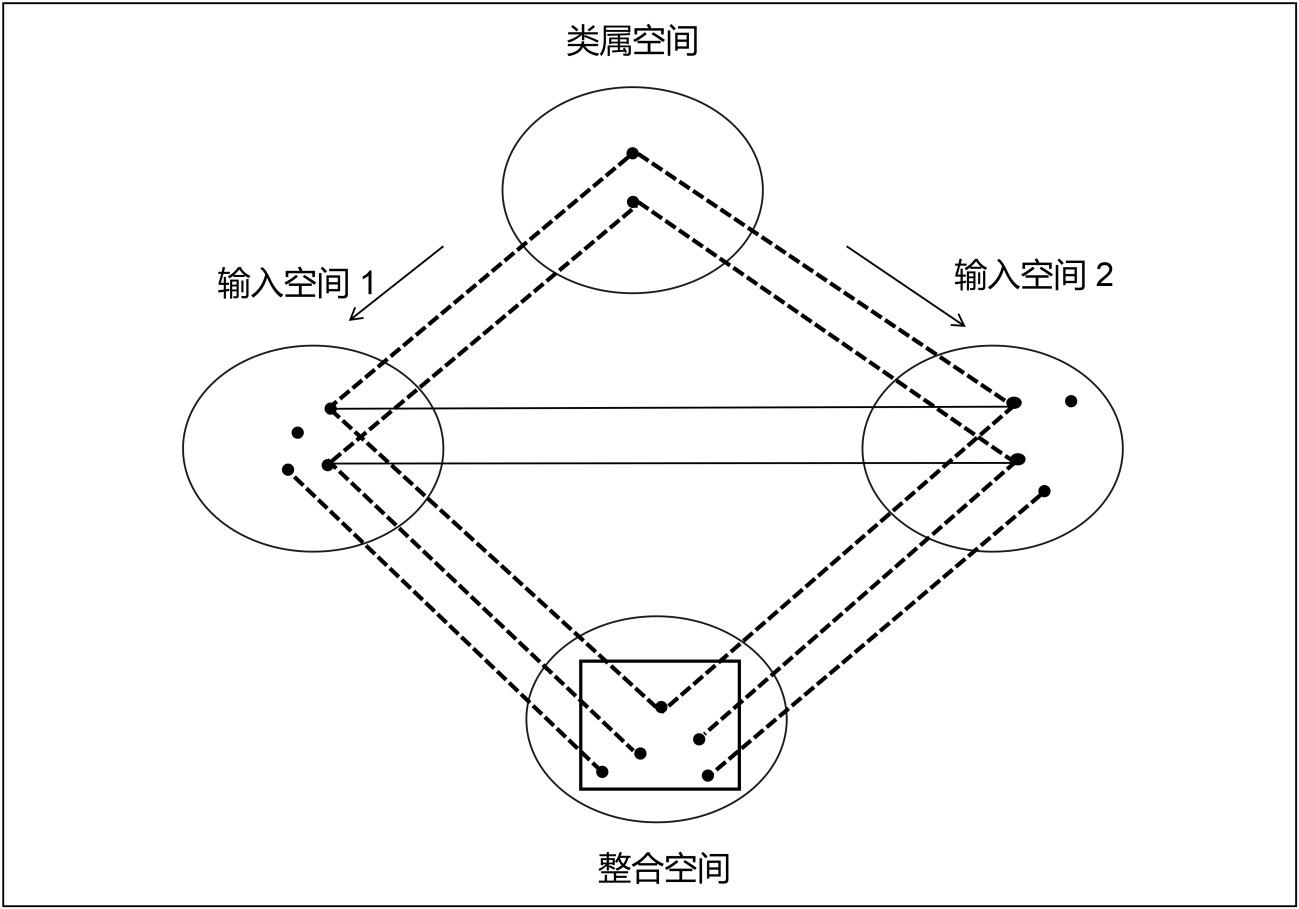 概念整合理论(Conceptual Blending Theory)是由Fauconnier和Turner (1998)提出的认知语言学框架,旨在解释概念意义建构的类比、递归等复杂心理认知过程。该理论主张,人类的认知能力通过整合来自不同心理空间的元素,创建新的意义和认知结构。如图1所示,概念整合过程涉及输入空间、类属空间和整合空间,其中两个输入空间分别对应源域和目标域,输入空间内共有的概念、结构以及图示映射至类属空间。类属空间内的元素则被有选择地映射至整合空间,从而输出新的概念[5]。