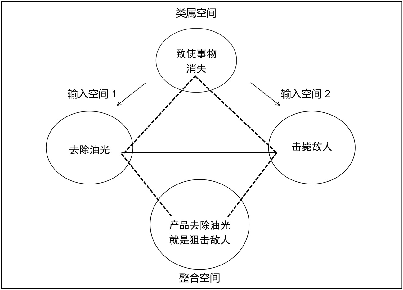 例1~例3展示了行为类隐喻表达。如例1所示,“狙击”原意是指对暴露目标进行射击,此处将去除面部油脂的过程隐喻为“瞄准敌人”。其概念整合过程如图2所示:输入空间1为产品去除面部油脂的功能,输入空间2为对敌人进行射击的动作;两者的类属空间为“致使事物消失”;最终将“去除面部油脂”整合为“狙击敌人”的抽象概念。此类拟人化的概念整合方式为品牌拟人化策略,被广泛应用于广告中,使品牌产品具备人类的特征与动机[19],有助于引发消费者形成对品牌的良好印象,提升广告营销效果[20]。同时,这种隐喻将正常的生理现象(如面部油脂)病理化、敌人化。通过将皮肤建构为“战场”,成功制造了一种紧迫的身体危机感。这种策略通过话语制造恐慌,随即推销“武器”(产品),促使消费者产生购买行为。