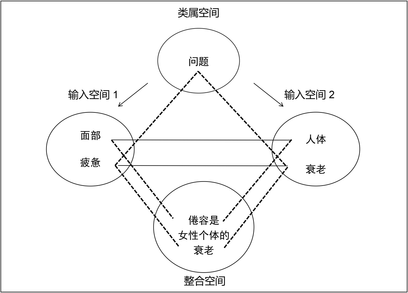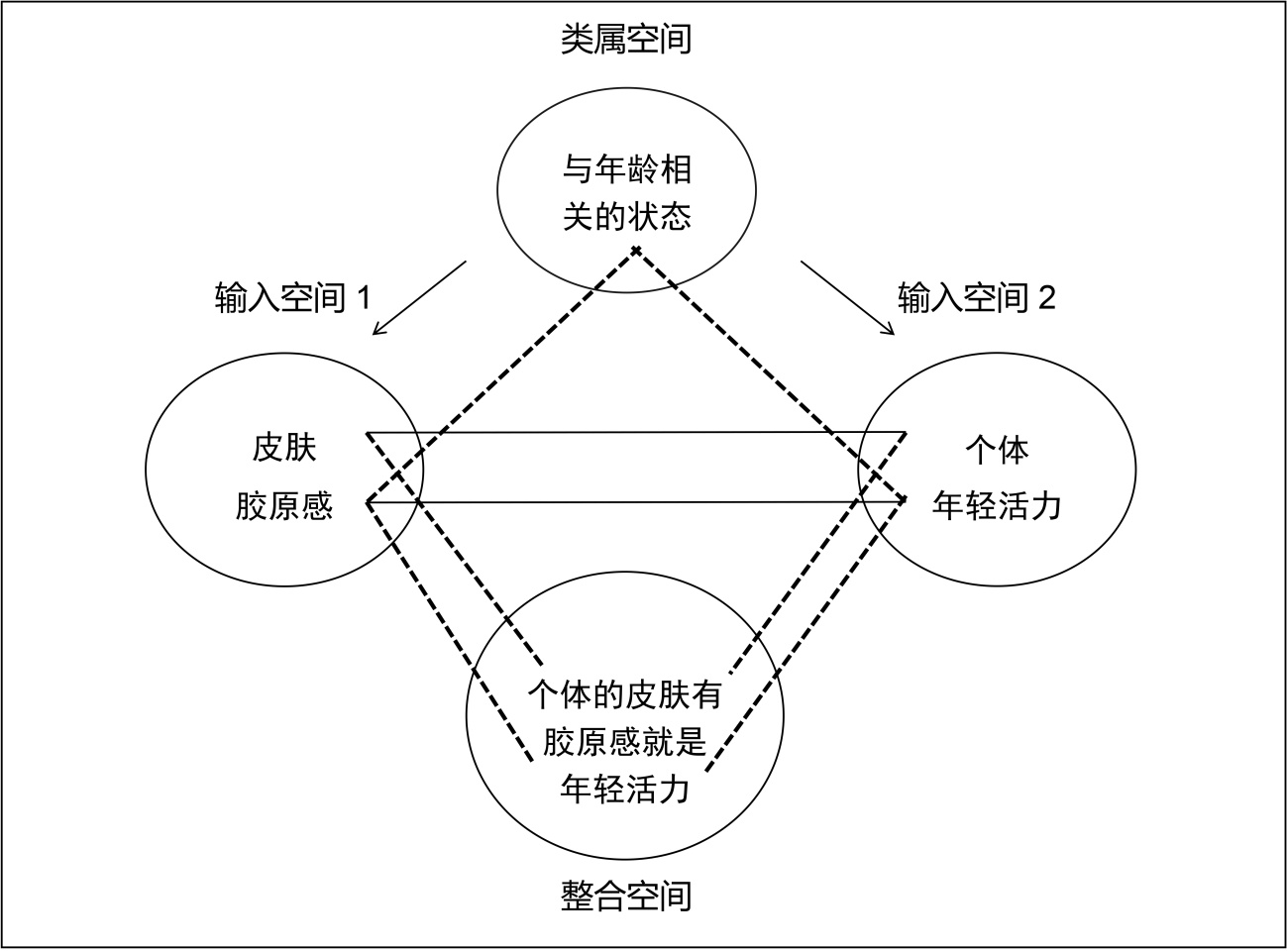 除了问题隐喻之外,另一类隐喻则将化妆品的效果整合进消费者期望的外貌或形象之中(见例10~12)。在例10中,“胶原感”这一表达与胶原蛋白所带来的效果相关——胶原蛋白是一种有助于保持关节健康和皮肤弹性的蛋白质。输入空间1指的是含有胶原蛋白的皮肤,输入空间2则指个体的年轻与活力,其类属空间为与年龄相关的某种状态(见图5)。最终形成的隐喻整合为“皮肤含有胶原蛋白的状态即个体拥有年轻活力的状态”。该隐喻构建了单一的美丽标准,固化了“年轻即正义”的价值观,使女性陷入对自身容貌不自信的心理内耗。