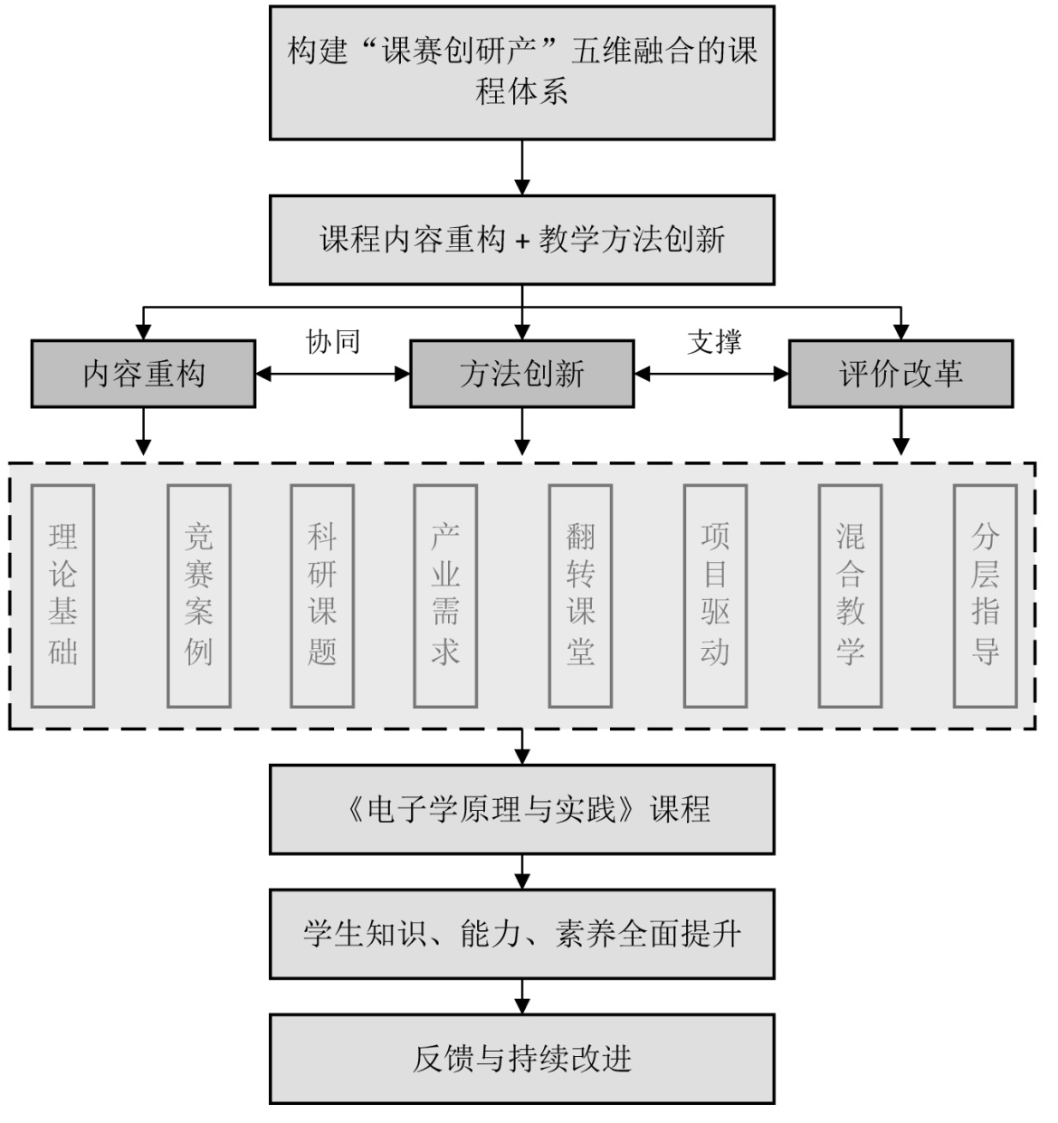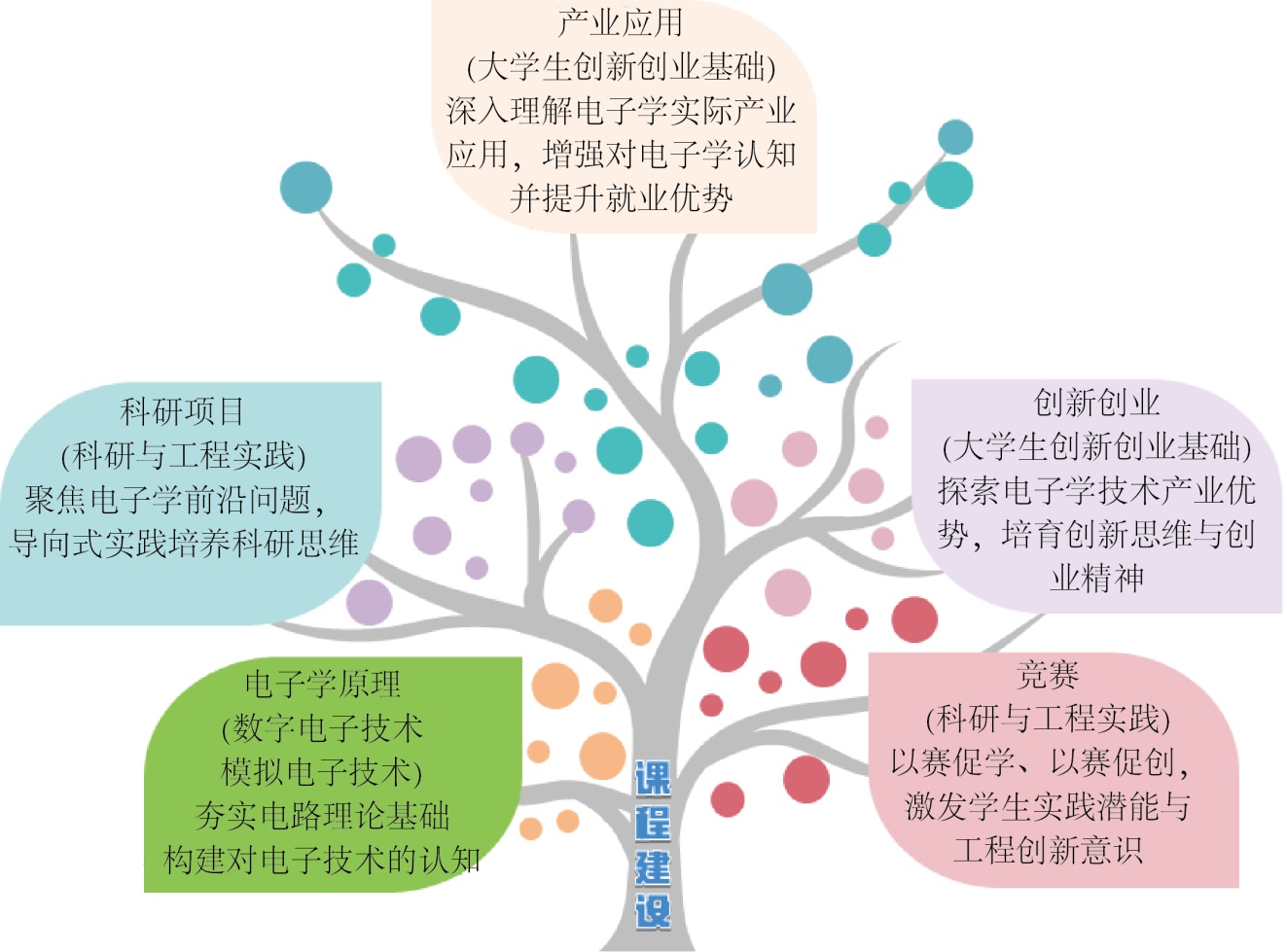图1. 基于“课赛创研产”五维融合理念的电子学原理与实践课程建设