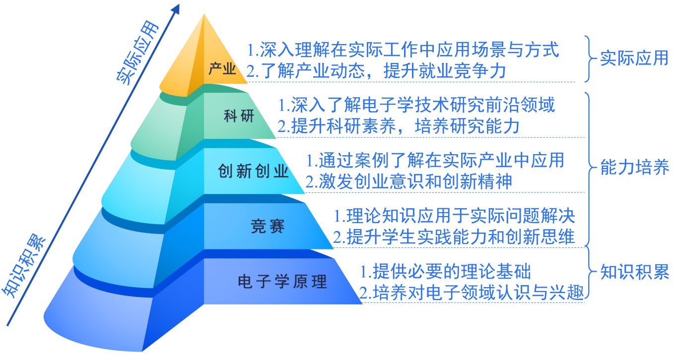 国家对于人才结构性培养的转变,课程建设对于精品课程的明确要求,以及信息化技术的快速迭代,正从根本上重塑教与学的模式和内容。这些深刻变化对传统教学的教育目标、内容体系、实施方式及评价机制等方面带来了全方位冲击与挑战,促使教学改革创新成为不可逆转的趋势。教学改革不仅是教育系统自身现代化转型的关键环节,更是夯实国家未来竞争力、精准对接并满足经济社会高质量发展需求的重要支撑。正是在这样的背景下,为顺应时代发展,围绕电子学课程,通过持续探索、实践与总结,逐步形成了“课赛创研产”五维融合的电子学课程体系。这一课程模式不仅能够有效解决当前教学中存在的理论知识碎片化且与实践脱节、系统思维和工程思维不足等问题,还能借助多元化教学活动和创新性教学环境的构建,全面提升学生的工程应用能力和理论创新能力,为学生未来的职业发展和学术研究奠定坚实基础。