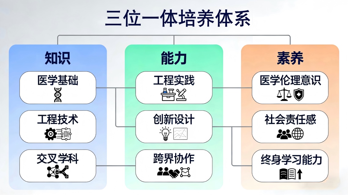 医学基础(解剖生理学、临床医学概论)、工程技术(Python程序设计、信号与系统)、交叉融合(医学图像处理、医疗大数据挖掘) |