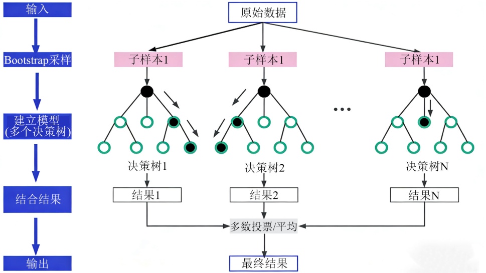 随机森林(RF)是一种集成学习方法,它通过构建多棵独立的决策树,并将其预测结果进行整合,从而提高模型的准确性并减少过拟合的风险。RF进行电力负荷预测的过程通过构建多个独立的决策树来降低过拟合风险并提高预测精度。首先,使用Bootstrap抽样方法从历史电网负荷数据中随机抽取多个训练子集,每个子集用于训练一棵决策树。在训练过程中,每棵树通过随机选择特征子集来分裂节点,确保模型的多样性和稳定性。对于每个新的预测输入,随机森林将通过所有决策树的输出结果来给出最终预测值。在回归问题中,这个预测值是所有树预测结果的均值。通过集成多个决策树的预测结果,随机森林能够有效提高模型的准确性和鲁棒性,从而在电力负荷预测中取得较好的表现。主要步骤如下: