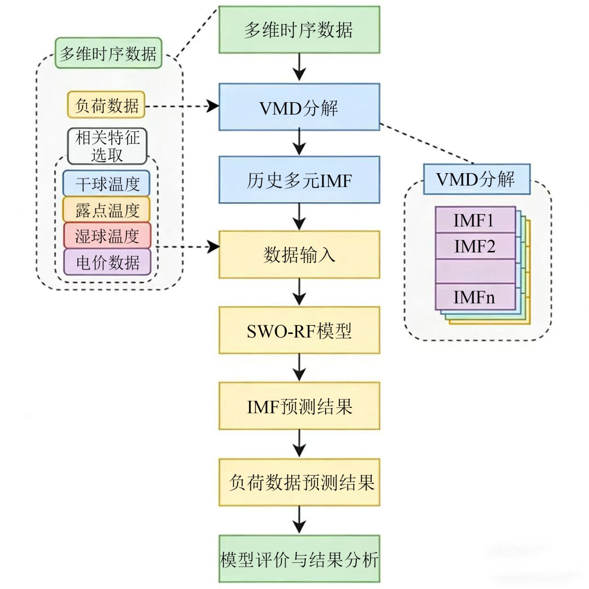 为提升电力系统短期负荷预测精度,本文提出一种基于VMD-SWO-RF的电力负荷预测模型。具体模型流程如图5所示: