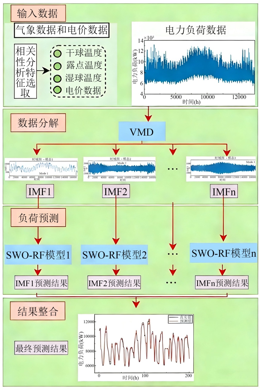 通过SWO-RF模型对每个负荷模态分解结果进行预测;最后将所有SWO-RF模型输出结果进行整合,得到最终预测结果,模型框架图如图1所示。