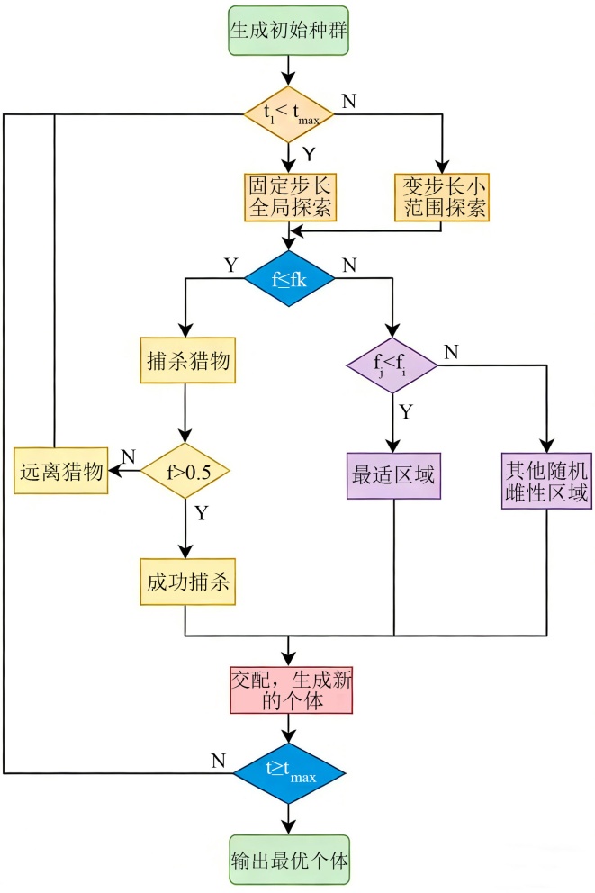 蜘蛛蜂算法(Spider wasp optimization, SWO)模拟了蜘蛛蜂的行为,包括搜索、追捕、筑巢和交配4个阶段,主要应用于求解复杂的优化问题,能够在大规模、高维度的优化问题中获得较好的表现,主要步骤如下: