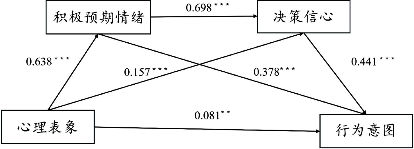 数据去中心化处理后,回归分析结果显示,心理表象的直接效应显著(β = 0.081, p < 0.01)。在各方程中,心理表象可以显著正向预测积极预期情绪(β = 0.638, p < 0.001)与决策信心(β = 0.157, p < 0.001),积极预期情绪可以显著正向预测决策信心(β = 0.698, p < 0.001)与行为意图(β = 0.378, p < 0.001),决策信心可以显著正向预测行为意图(β = 0.441, p < 0.001)。