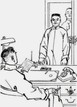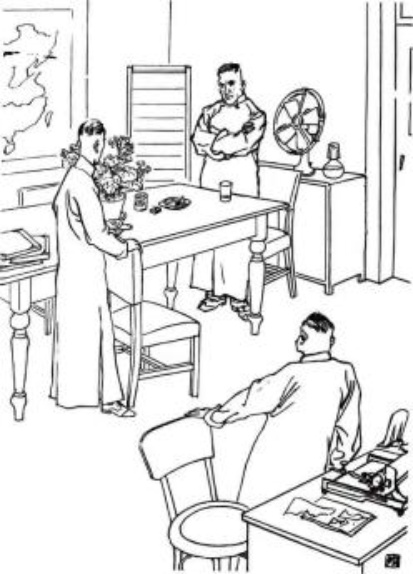 首先,是树立权威与高傲审视。在图1的初次登场中,吴荪甫深陷于高背沙发中,身体后仰,呈现一种占据主导地位的放松姿态。一只手随意地拿着信笺,另一只手则拿着香烟,显示出他的从容与优越感。此时,叶浅予用硬朗的直线条勾勒吴荪甫的西装、肩膀和面部轮廓。反之,屠维岳则是微躬的站姿、右手在身前微握,线条略微收敛,显示出他面对权力时的紧张与恭顺。服装的褶皱处理得更为规矩,与他此时小心翼翼、力求表现的身份相符。叶浅予刻画了一种混合着忠诚、野心与一丝不确定的复杂神情。他的目光直视吴荪甫,但眉头或许微蹙,嘴唇紧抿,精准可视化了文本中“从今天起,我算是替三先生办事了”所包含的距离、效忠与不确定的未来。