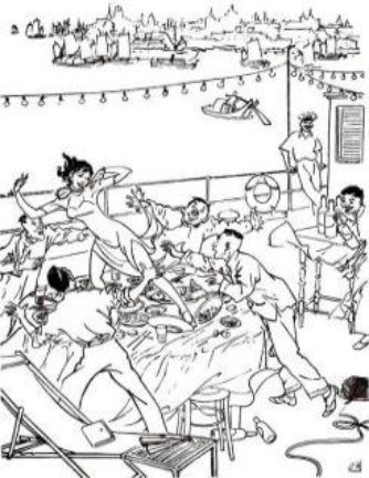 与之对比的,是都市欲望舞台上张扬的表演者徐曼丽(见图5)。在江轮狂欢中,叶浅予以飞扬、灵动、飘逸甚至略带浮夸的曲线勾勒其飞扬的裙摆与曼妙身姿。这是一个“虚浮的孕育性顷刻”,她的身体成为全场男性“欲望凝视”的焦点。与蕙芳的封闭压抑空间相反,徐曼丽处于开放喧闹的舞台,这恰恰象征了她作为公共“观赏物”的属性。徐曼丽是画面中的焦点,构成了一个视觉的中心。她的身体处于一种极度伸展、旋转的舞蹈姿态中。手臂张扬,脖颈后仰,腰肢扭动,每一个动作都在试图抓住所有人的注意力。徐曼丽的脸上挂着职业性的、灿烂却空洞的笑容。她的眼神飘向远方或挑逗地扫视观众,这正是文本中“徐曼丽俏媚的声浪在沉闷的空气中鼓动着,她想施展她特有的魔力挽回这僵局”的画面呈现。叶浅予通过徐曼丽的动作与神态、周围男性贪婪前倾的群像描绘,揭露了这份表面生命力下的虚伪与危险,使其成为都市浮华与物化女性的符号。
