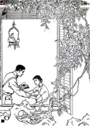 在“雷参谋与林佩瑶重逢”的场景中(见图6),是情感枷锁下隐忍的压抑者林佩瑶。叶浅予巧妙地利用窗户这一意象作为天然的取景框,窗户框定了画面,也将两个人的情感禁锢在这一方天地之内。两人身体距离极近,但姿态又充满克制——林佩瑶虽端坐,但微微前倾的身体与交缠的手臂泄露了内心的慌乱与欣喜,这个精心的设计,高度凝练了原文中那段复杂的情感纠葛“林佩瑶的手腕被雷参谋握着,她感到一阵心悸,想抽回,又舍不得……他们俩的眼光碰在一处,千言万语,不知从何说起”。这种视觉上的含蓄,完美地复现了文字的留白。画家以含蓄细腻的线条勾勒他们低垂的眼睑、紧抿的嘴唇与交缠的手臂,将原文中“千言万语,不知从何说起”的复杂情愫与内心汹涌的压抑感视觉化。雷参谋微微前倾,手抚林佩瑶手臂,传递出怀念与遗憾。叶浅予没有大幅度地挥洒,而是用含蓄的笔触勾勒侧脸、手臂的弧度,通过低垂或微侧的眼睑,将那种千言万语不知从何说起、谨慎又暧昧的情愫展现得淋漓尽致。这幅双人构图的核心仍是女性角色:林佩瑶的“抑制”姿态,泄露了其在既定婚姻与社会规范下,情感无法纾解的深层困境。
