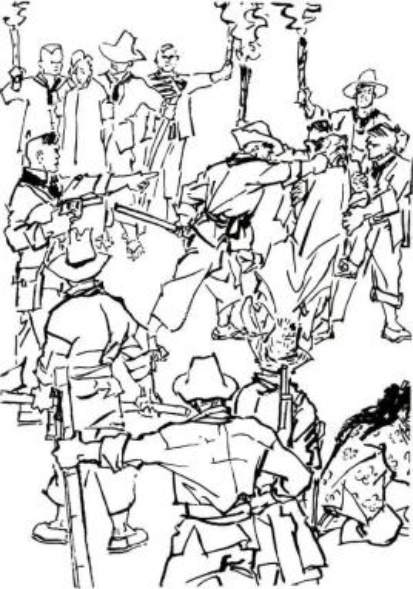 首先,是社会暴力下个体的脆弱。图7描绘的是双桥镇农民暴动中,土豪劣绅曾沧海父子被抓获并公开审问的紧张场景。倾斜的构图与短促混乱的线条,将抓捕的突发暴力与个体的无力挣扎视觉化。画面中曾沧海被几名武装人员围捕,身体被拉扯、姿态扭曲,显得瘦弱而卑微,而画面中的武装人员体格健壮、手持枪支、一手指向曾沧海大声呵斥,展现出觉醒的农民群体的力量与威严。叶浅予使用短促、锐利且方向混乱的线条勾勒人物轮廓与衣纹,尤其是曾沧海挣扎的手臂与围捕者紧绷的肢体,线条交错如网,传递出被捕瞬间的暴力与无助这一“被捕的顷刻”不仅是情节的再现,更是对乱世中个体命运如草芥的深刻隐喻。