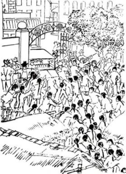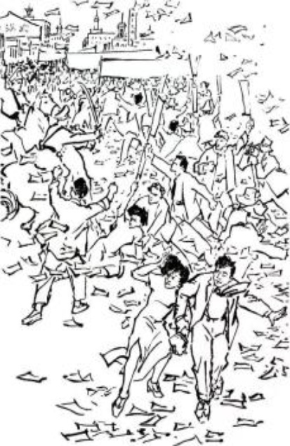 与此形成对比的是图8的“群众游行”。这幅插图捕捉了“五卅运动”中示威队伍如潮水般汇聚、行进的瞬间。这是一个集体力量“觉醒的孕育性顷刻”。叶浅予改用略带仰视的视角和具有导向性的统一动势,描绘出队伍如洪流般行进的磅礴瞬间。画家用肯定且富有弹性的长线条勾勒出人物的轮廓和行进的动态,避免了琐碎的细节。人物的朝向、旗帜的方向、传单飘落的轨迹都大致指向同一个前进方向。形成了一股凝聚的、目标明确的“势”。再现了小说中“群众一路散着传单,雷震似的喊着口号,‘反对军阀混战’”磅礴声势。
