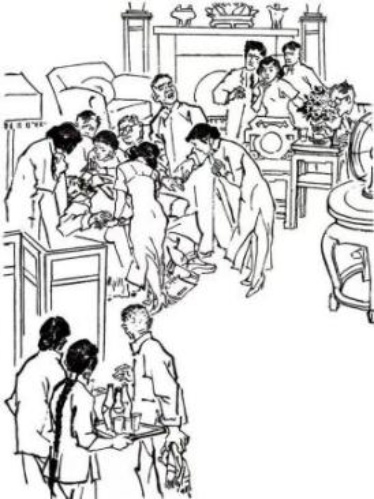 吴老太爷初到上海时,猝死于吴公馆客厅的关键捕捉(见图10)。画家以精细且富有张力的线条勾勒出“中西合璧”的混杂现场:流畅曲线描绘的西式沙发、吊穗的台灯、旋转着的风扇、与硬朗直线刻画的中式家具并置,既突出了物体的质感与空间层次,又通过线条的虚实变化营造出场景的奢华氛围。“他身旁有一个怪东西,是浑圆的一片金光,荷荷地响着,徐徐向左右移动,吹出了叫人气噎的猛风,像是什么金脸的妖怪在那里摇头作法。一切红的绿的电灯,一切长方形,椭圆形,多角形的家具,一切男的女的人们,都在这金光中跳着转着。”[5]视觉化了传统价值观在现代文明冲击下的剧烈碰撞。画面一角,吴老太爷紧攥的《太上感应篇》则与整个环境形成讽刺——这件他赖以护身的传统法器,在光怪陆离的现代客厅中显得如此苍白无力。其“猝死的顷刻”实则是其所代表的旧世界精神被彻底碾碎的视觉隐喻。这个空间是奢华而有序的,但其内在的文化冲突已预示了不稳定性。