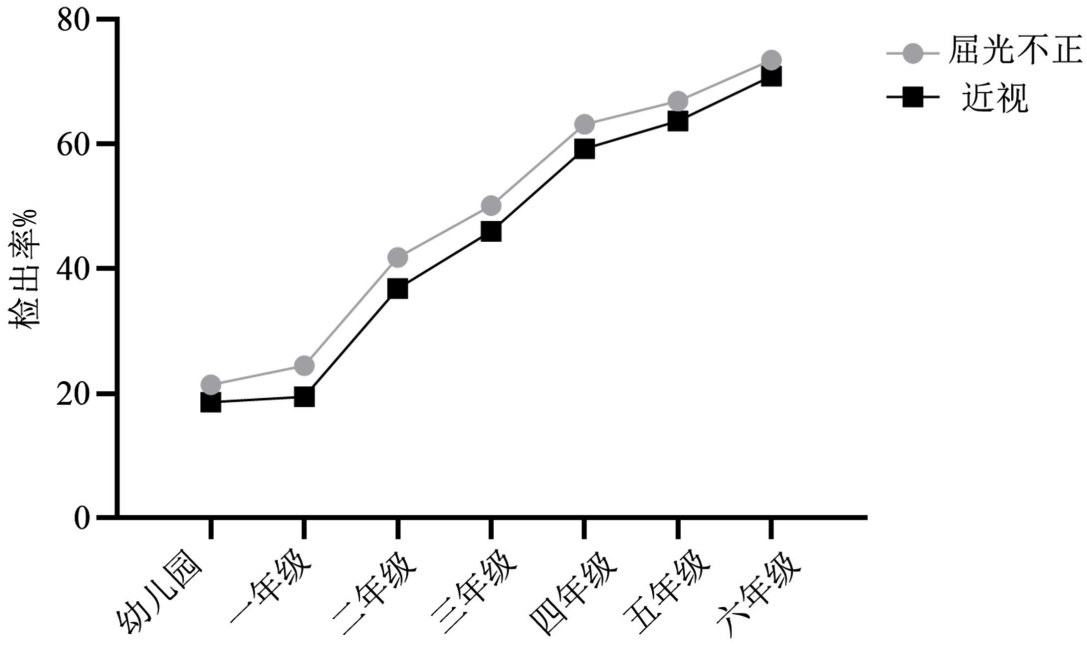 Figure 1. Detection rate of ametropia and myopia among different grades in Suzhou City