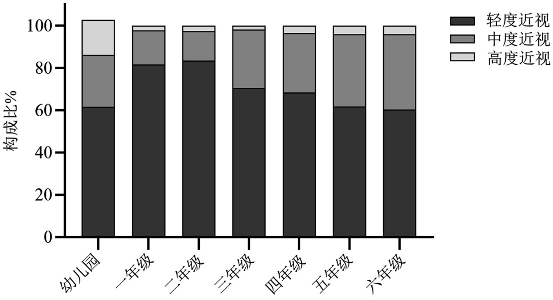 图2. 宿州市儿童各年级轻、中、重度近视构成比