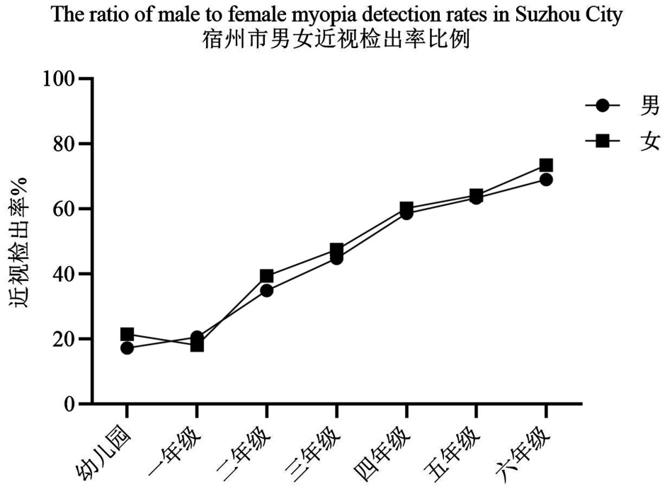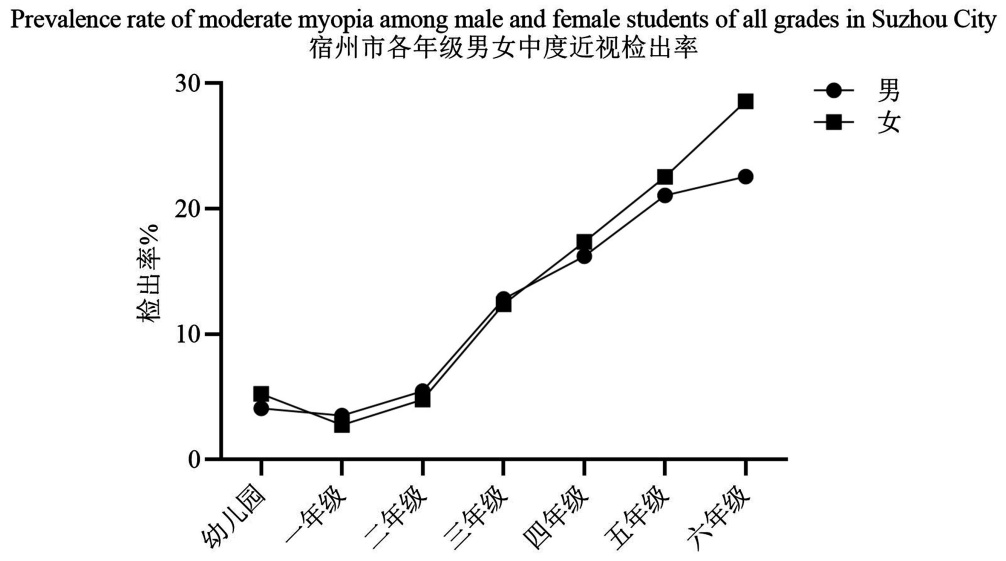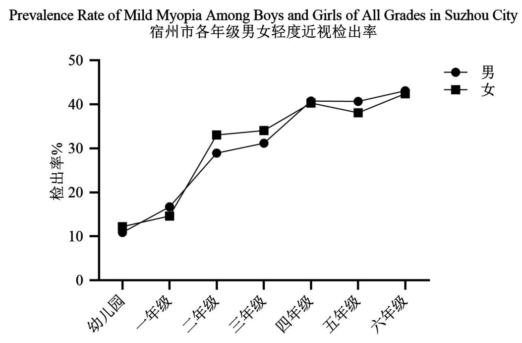 2019年国家卫健委公布的《2018年中国儿童青少年近视调查结果》显示,中国小学生近视检出率为36%,初中生近视检出率为71.6%。本研究结果显示,宿州市儿童的近视患病率高于全国水平,六年级近视检出率已经达到初中生程度。而且研究结果表明,尤其从儿童上小学以后,近视检出率增加的趋势陡然上升,这可能与学业负担加重、户外运动时间减少以及电子产品接触增加等情况相关[6] [7]。
