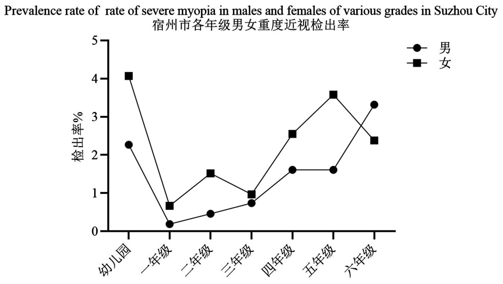图3. 宿州市各年级男女生近视及近视严重程度检出率
