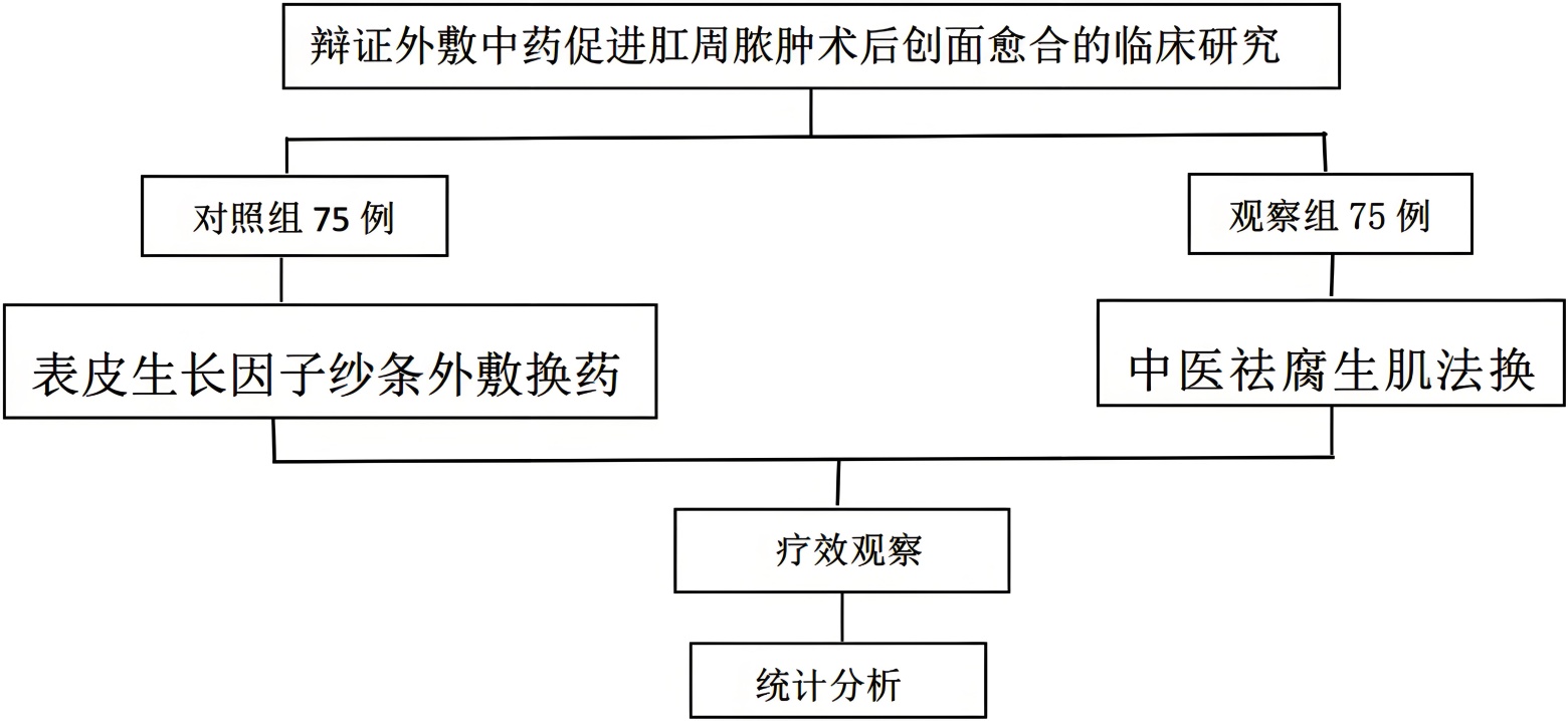 按照要求选择符合标准的病例。随机按1:1分成对照组和研究组。对照组行表皮生长因子纱条外敷换药治疗,研究组行中医祛腐生肌法换药治疗,然后观察疗效,最后对数据进行统计分析,见图1。
