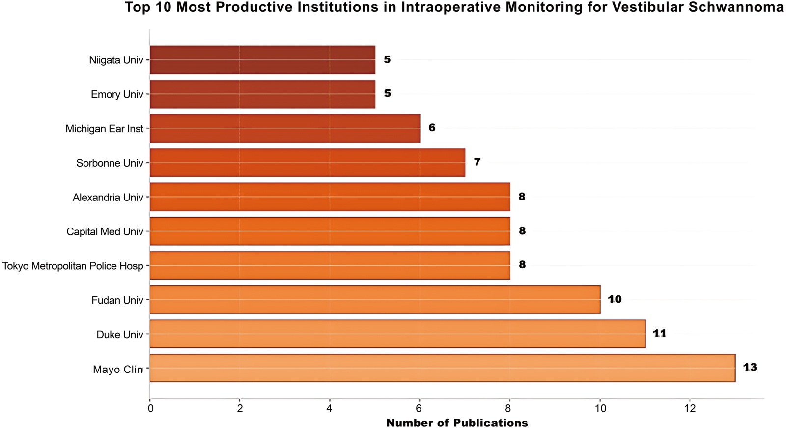 图3为全球各机构有关听神经瘤术中神经电生理技术方向的发文量情况,我们可以从图中发现Mayo Clinic (梅奥诊所)以13篇发文量位居榜首,总被引687次,篇均被引52.8次,显示出卓越的学术影响力,该机构对听神经瘤手术中的颅神经监测做了非常完整的综述,是极具影响力的机构[11]。中国的复旦大学和首都医科大学分别位列第三和第五,是亚洲地区最主要的研究贡献者,显示了该领域研究力量的多元化分布。体现了听神经瘤术中神经电生理监测技术研究高度集中于全球顶级的神经外科与耳神经外科临床中心,反映了其与复杂临床实践紧密相连的特点。