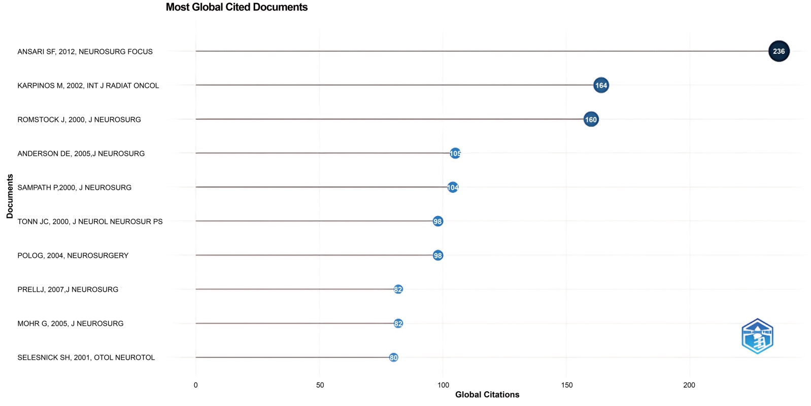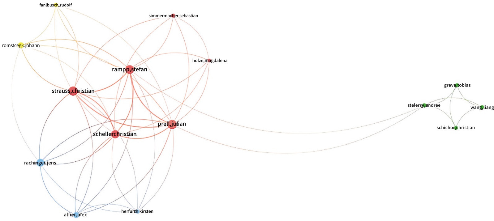 通过期刊共被引分析,我们发现Journal of Neurosurgery、ACTA Neurosurgery和Otology & Neurotology三种期刊是被引用最多的三种期刊,形成了该领域的主要知识交流平台。表明该领域研究主要集中于少数专业期刊。