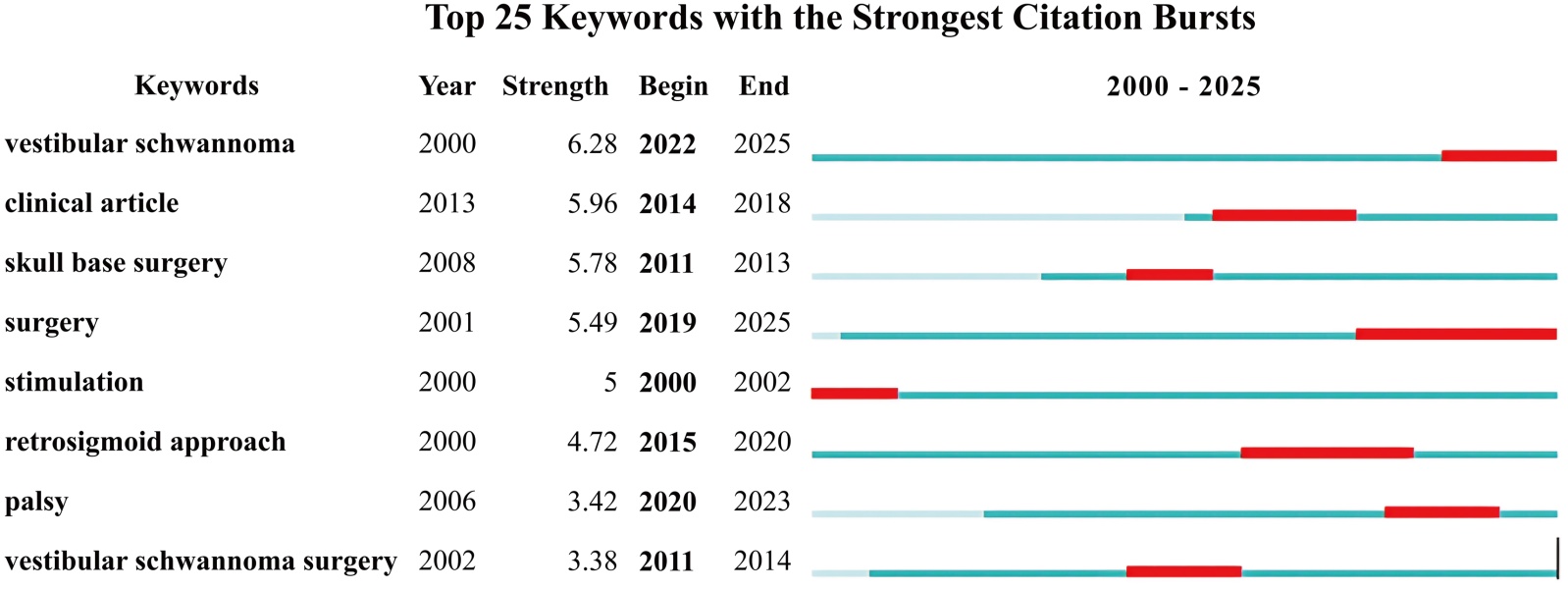 同时为了更精准识别不同时期的研究前沿,本研究进行了突现词检测(图6)。结果显示,研究前沿呈现显著的阶段性更替。早期(2000~2002年)前沿集中于stimulation (刺激)等监测技术本身的探索;中期(2011~2015年)则聚焦于skull base surgery (颅底外科手术)与vestibular schwannoma surgery (听神经瘤手术)等具体术式的应用与优化[17]-[19];而近期(2020~2025年)最强烈的突现信号来自surgery (手术)和vestibular schwannoma (前庭神经鞘瘤)这两个基础术语的再度热门,且持续至今。这一现象表明,当前的前沿并非全新概念的创造,而是在手术技术深化的背景下,对核心临床问题进行再探索与结合其他技术如术中电生理监测的整合性研究[20]。