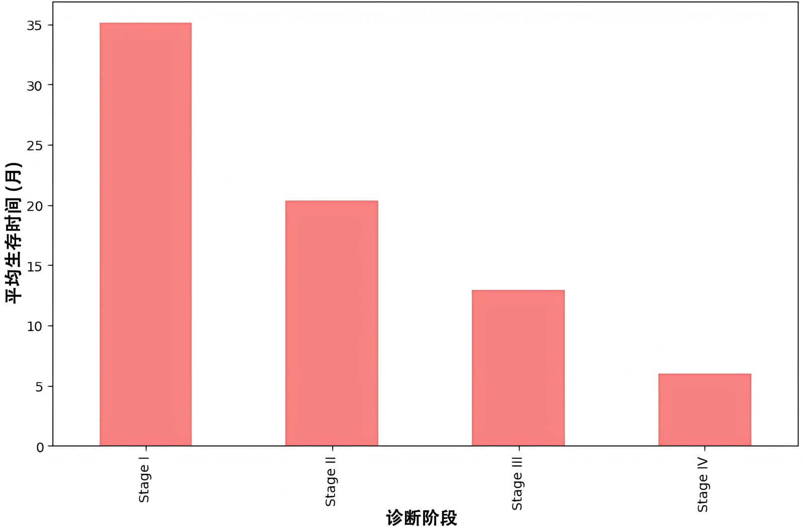 图1展示了胰腺癌不同阶段患者的平均生存时间(单位:月)。从图中可以看出,早期的第一阶段(Stage I)具有较长的生存时间,约为35个月,而随着癌症进展到第二阶段(Stage II),生存时间显著下降至约20个月。进入第三阶段(Stage III)和第四阶段(Stage IV)后,生存时间进一步缩短,第四阶段的患者生存时间大约为5个月。这一分析表明,胰腺癌的生存期与其诊断阶段密切相关,早期发现和治疗对于提高生存率至关重要。