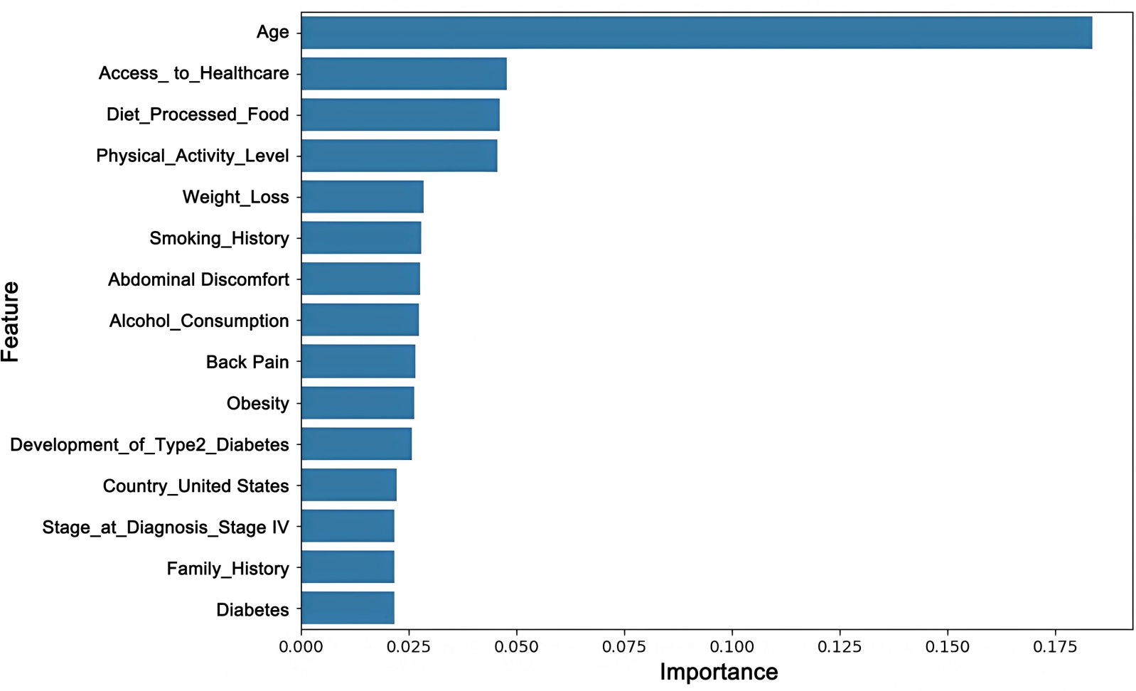 图2展示了不同特征在胰腺癌生存状态预测中的重要性。通过分析图中的条形图,可以看到,年龄是最重要的特征,其重要性值为0.175,显著高于其他特征,表明年龄在胰腺癌生存状态的预测中占据了核心地位,可能与患者的预后密切相关。紧随其后的是医疗可及性(Access to Healthcare)和加工食品饮食(Diet Processed Food),它们的重要性值分别为0.12和0.11,表明患者是否能方便地获得医疗服务以及饮食习惯,特别是摄入加工食品的情况,对胰腺癌的预测有着重要影响。此外,体力活动水平(Physical Activity Level)和体重下降(Weight Loss)这两个特征的重要性也较为突出,分别为0.09和0.08,表明这些生理和生活习惯因素与胰腺癌患者的生存状态存在一定关联。吸烟历史(Smoking History)和腹部不适(Abdominal Discomfort)等特征的贡献度也不可忽视,分别为0.07和0.06,揭示了生活方式和临床症状对生存预测的重要性。虽然一些特征如酒精消费(Alcohol Consumption)、背痛(Back Pain)、肥胖(Obesity)、2型糖尿病的发展(Development of Type2 Diabetes)、美国国籍(Country United States)、诊断阶段IV (Stage at Diagnosis Stage IV)、家族病史(Family History)、以及糖尿病(Diabetes)的权重较低,但它们在胰腺癌的生存状态预测中仍然起到了一定的作用。总体而言,图中的分析有助于我们识别出哪些临床特征和生活方式因素对胰腺癌患者生存状态的预测至关重要,为未来的临床决策和治疗策略提供了有价值的参考。