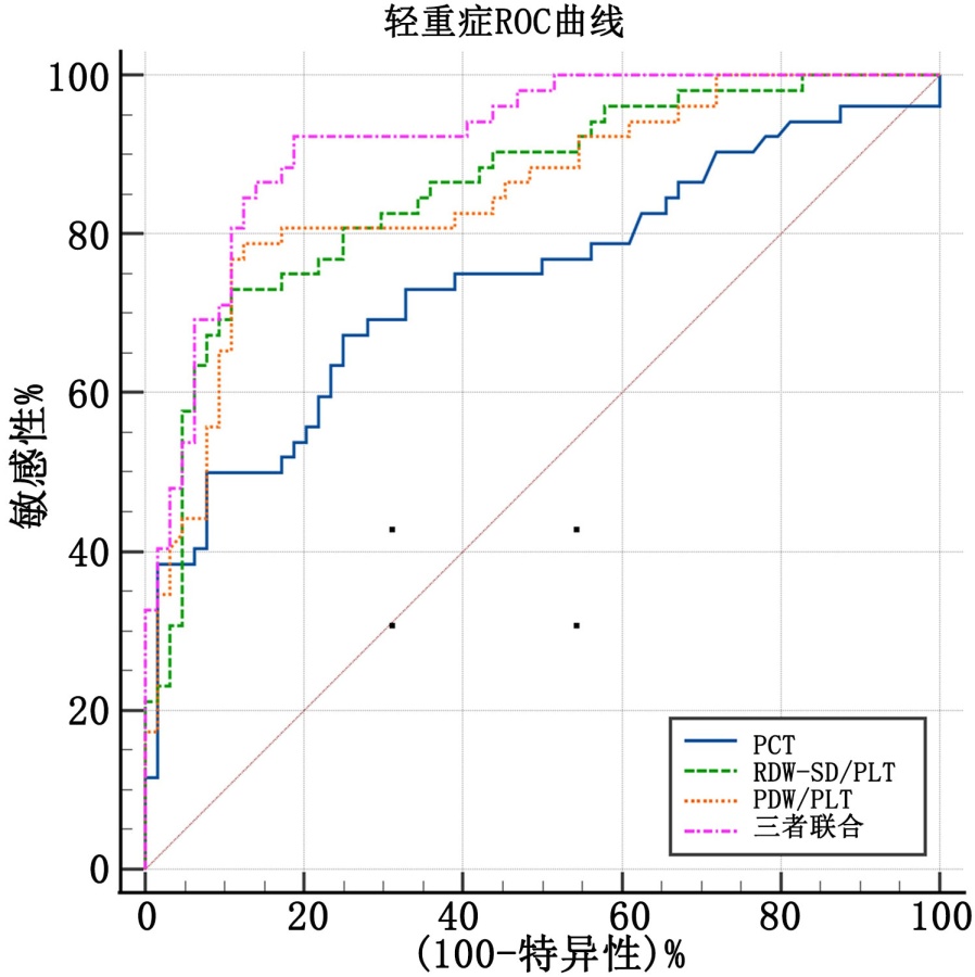 表3. 轻症组与重症组一般资料及PCT、RDW-SD/PLT、PDW/PLT水平比较