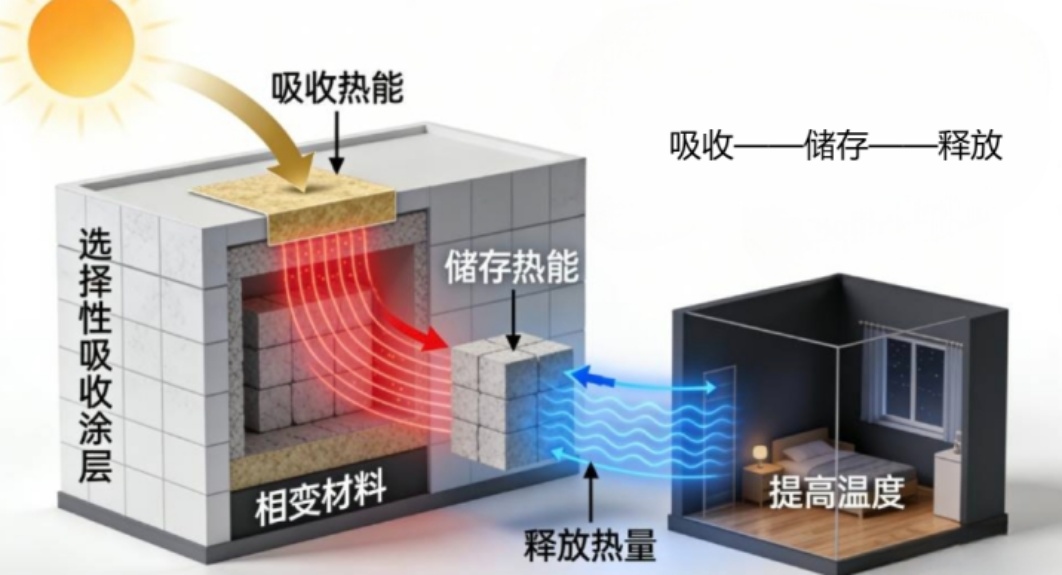 太阳能作为一种清洁、可再生能源,选择性吸收涂层可高效吸收太阳能。将相变材料与太阳能集热系统相结合(如图1),构建的耦合系统在白天阳光充足时,吸收涂层捕获的太阳能传递给相变储热单元;当夜间或阴天太阳能不足时,相变材料释放储存热量维持室内温度。吸收涂层与相变材料的耦合运行,不仅为相变材料提供了能量来源,也将太阳能利用效率从传统的65%提高到82%。研究发现该耦合系统在保持室内温度20℃时,比传统系统时长多4 h [9] [10],且在不同天气条件下稳定性、可靠性更高,可进一步推动现代建筑向绿色低碳方向发展。