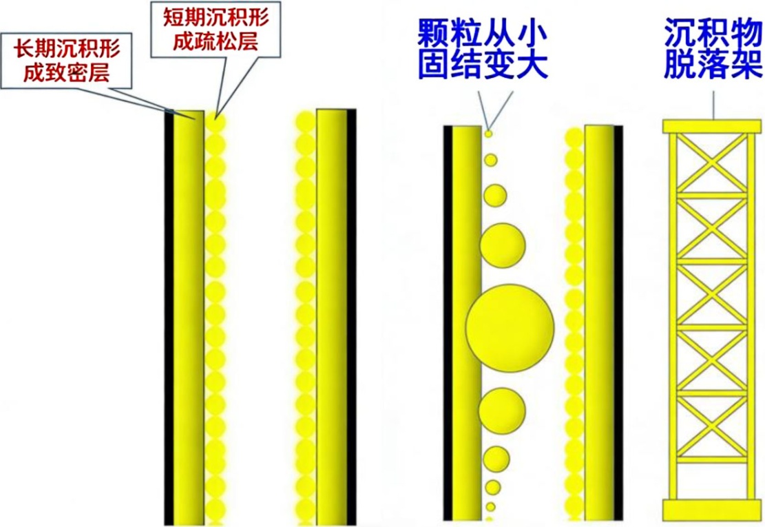其中,渐积式堵塞(详见下图)的形成机制与动态响应特征如下:该类堵塞源于气相介质中单质硫组分发生相变析出,并以固相形态持续沉积于油管内壁表面;随着沉积过程的持续进行,固相沉积物的厚度呈现逐步增大的变化趋势,进而对油管的有效流通截面形成持续性侵占,最终引发油管通道的渐进式缩径[7]。在生产动态响应层面,渐积式堵塞引发的生产参数变化具有显著的同步性特征,具体表现为油井运行过程中的油压与天然气产量呈现同步波动的变化规律;同时,从堵塞诱因出现到生产参数呈现明显异常的全过程,具有响应周期较长的特点。