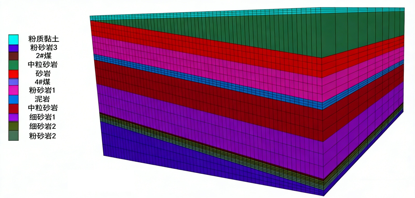 根据地层结构,划分为12个岩组,设置岩层沿倾向、走向、竖直方向分别为x、y、z轴,构建一个800 m × 1000 m × 500 m的三维数值模型[13],生成20,480个单元和23,595个节点,数值模型如图1所示。为消除边界效应,在煤层开采初始阶段,沿倾向和走向分别预留100 m、200 m宽的保护煤柱[14]。模型边界条件设置为:x轴与y轴方向施加位移及应力约束,顶部为自由边界。煤层采用长壁式综采全高开采工艺以及全部垮落法管理顶板,设定100 m开采步距,按“先2#煤后4#煤”顺序实施分层开挖,每层开挖待节点应力收敛平衡后推进,单煤层累计开挖6次,合计开挖12次。模拟过程中所涉及的岩石物理力学参数见表1。