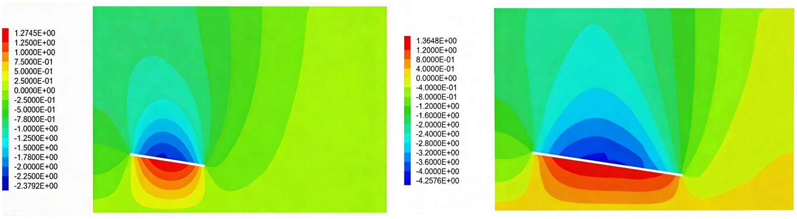 (c) 煤层倾角为24˚时地表沉降云图 (d) 煤层倾角为32˚时地表沉降云图