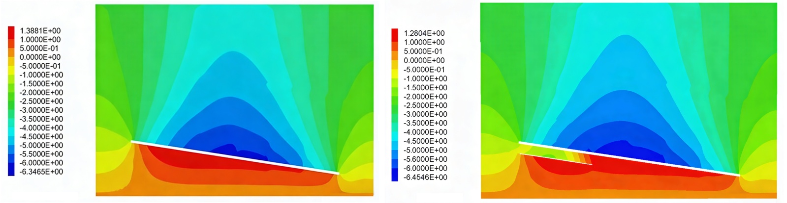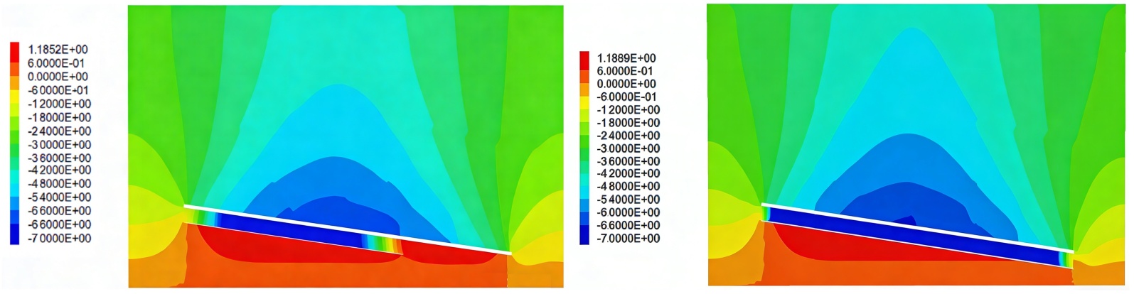 (a) 煤层倾角为0˚时地表沉降云图 (b) 煤层倾角为16˚时地表沉降云图