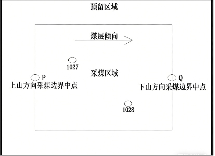 为了深入探讨不同采深和倾角条件下煤层开采对地表沉降的影响特征。研究选择煤层上山方向采煤边界中点(P)、开采区域沉降最大位置(O)以及下山方向采煤边界中点(Q)作为研究对象(见图5),通过模拟不同采深和倾角条件下的地表沉降变化,研究各因素对地表沉降的影响。