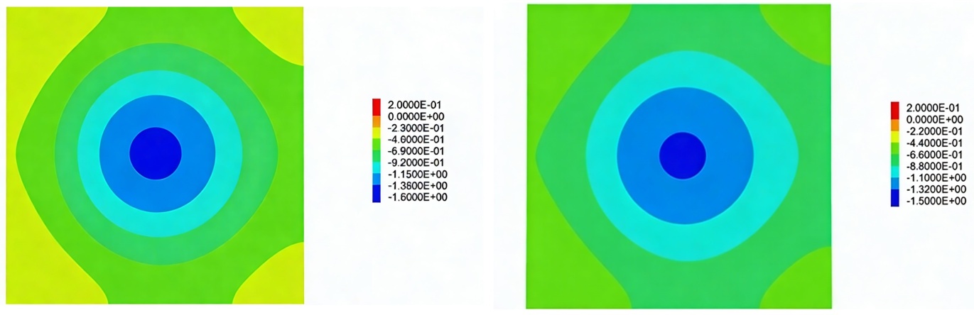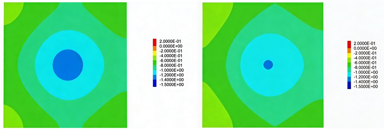 结合图6和图7,采深对地表沉降的影响呈现“范围缩小、峰值衰减”的协同效应。具体表现为:随着煤层采深的增加,地表沉降程度呈现规律性递减,这是由于深部开采覆岩厚度增大,岩体自重压力增强,抑制了变形向上传递。地面沉降呈现从中心向两侧逐步衰减的特征,颜色梯度的变化直观地反映了沉降程度的减小。沉降的影响范围随着采深的增加而扩大,在200 m~400 m采深范围内,最大沉降值从1436 mm降至905 mm,降幅达37%;因深部覆岩约束更强,变形向周边扩散的范围受限,沉降影响范围减小42%;沉降区域从开采中心向外扩展,开采活动对地表稳定性的影响逐渐减弱。