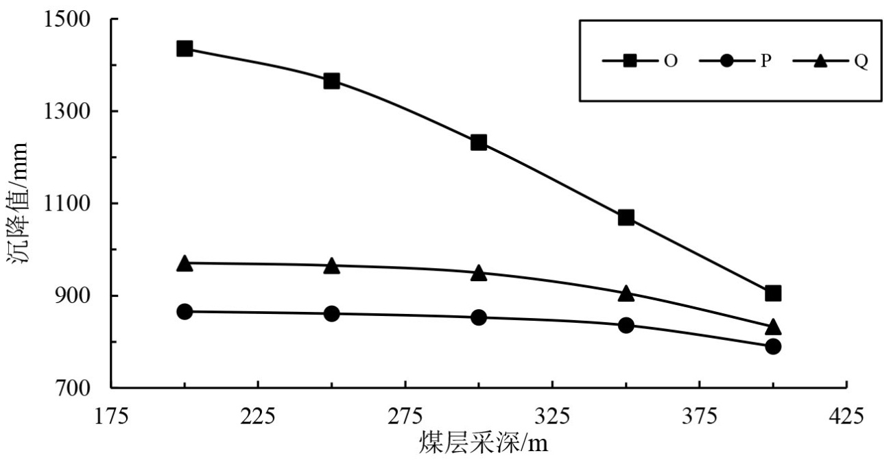 3) 下山方向采煤边界中点(Q)沉降值在初期变化平缓,随采深增大变化速率逐渐加快,整体呈凸曲线形态,且始终大于上山方向采煤边界中点(P)沉降值;随着采深的增大,P、O、Q三点的沉降值逐渐趋于一致。