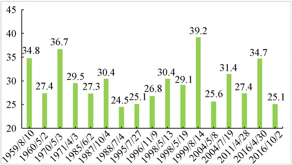 观测规范规定标准统计时段:当日20时至次日20时。取用降水量为研究数据,本文暴雨阈值标准:24小时降水量 ≥ 24.1毫米,大暴雨阈值标准:24小时降水量 ≥ 48.1毫米,数据情况如表1所示: