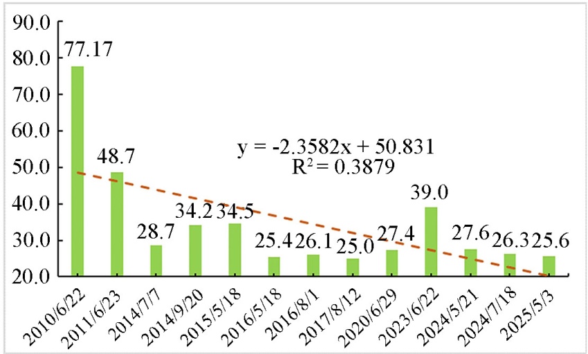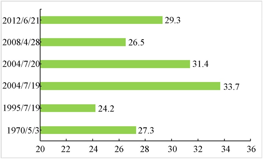 如表2所示,从时间分布阶段来看,2站暴雨过程在2001年后进入活跃期,在2001~2010年间,各出现3次暴雨过程,占暴雨频次的50%,炮台站在1955~1990年、1991~2000年、2011~2025年期间各出现暴雨1次;莫索湾站在1959~1990年期间出现暴雨1次,1991~2000年期间未出现暴雨,2011~2025期间出现2次。