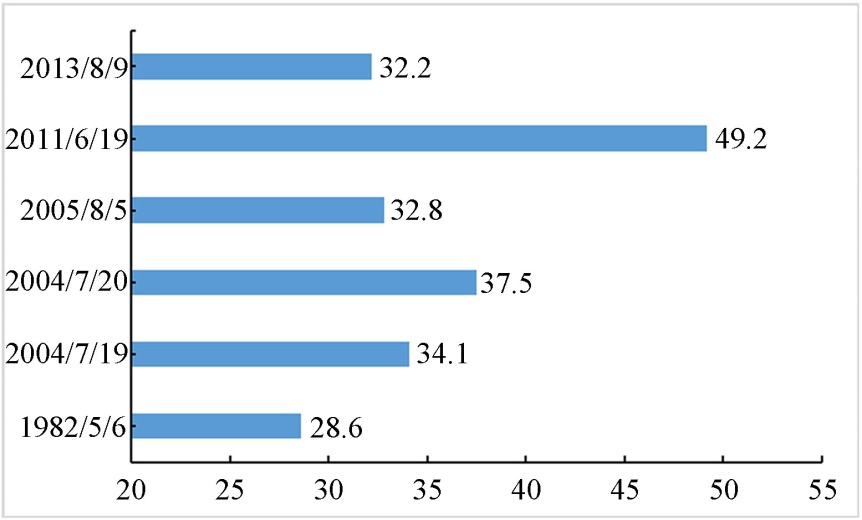 暴雨次数次多的站为142团33连站,累计出现暴雨13次,该站日降水量极值出现在2010年6月22日,降水量达77.7 mm,是整个石河子地区暴雨天气过程的降水量极值。同东大塘站相比,暴雨天气过程数量呈减少趋势。出现降水极值的站点均位于山区,地形抬升促进地形雨频发。