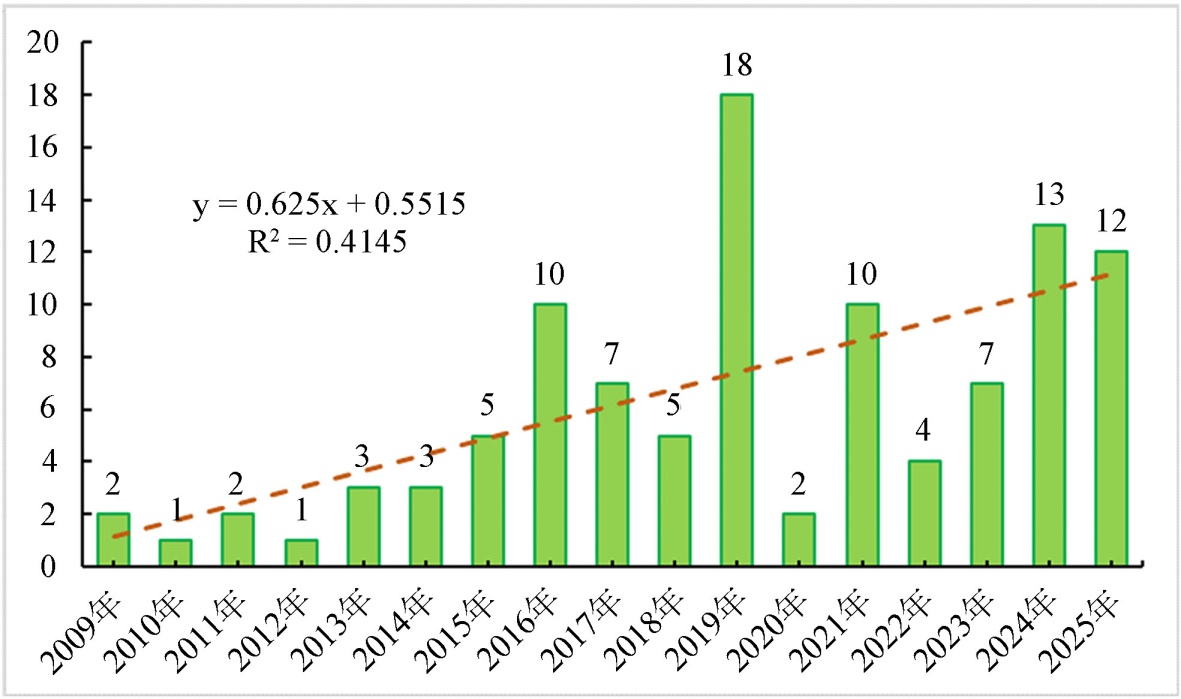 据统计,2009年~2025年期间,除个别年份外,暴雨发生的频次波动上升,在2019年达到峰值,累计出现18次暴雨过程,2024年、2025年暴雨过程频次持续位于高位,如图4。