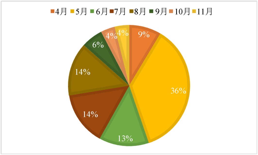 在统计的105次暴雨过程中,发生在5月的暴雨过程最多,占总数的36%,7月、8月各占14%,出现在10月和11月的频次最少,分别占4% (图5)。