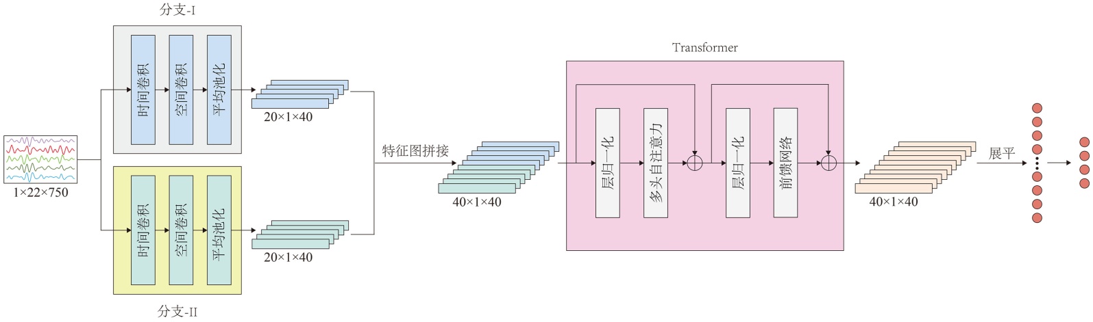 针对这些局限性,本文设计了一种双尺度时空特征融合网络(Dual-Scale Spatiotemporal Feature Fusion Network, DSSFFN)。该网络可同步提取脑电信号在不同尺度下的时间特征与空间特征,并通过有效的融合机制整合多尺度信息。主要贡献包括:我们提出了一种新的基于Transformer的双尺度时空特征融合神经网络来识别运动想象脑EEG信号,该网络捕获不同尺度的时间和空间信息,从而充分挖掘运动想象脑电信号的丰富表征;为进一步挖掘多尺度融合特征的潜在价值,引入Transformer实现双尺度信息的深度耦合,进而生成判别力更强的特征。