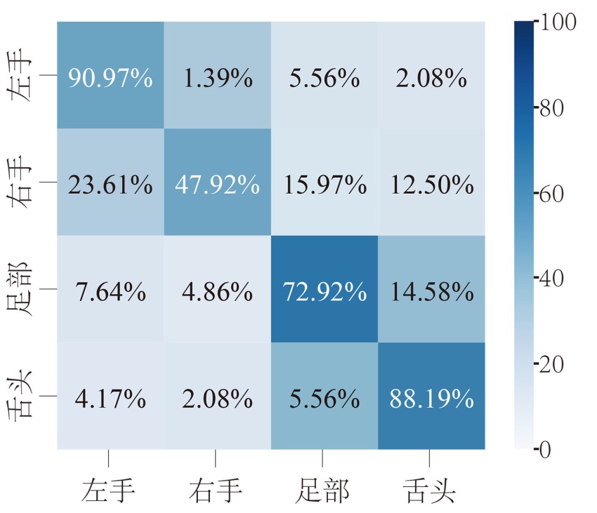 图3展现了DSSFFN模型对4类运动想象分类准确率的混淆矩阵。可以看出,DSSFFN擅长分类左手运动想象和舌头运动想象任务,准确率分类达到90.97%和88.19%。相较于右手运动想象任务来说,其他3类的分类准确率远高于该类。