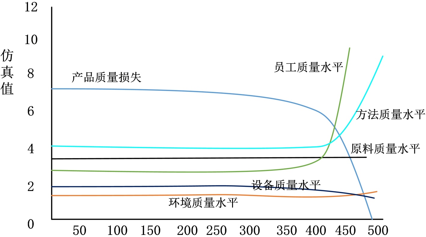 仿真初期,人员、机器、物料、方法、环境和测量主体的质量水平平稳。员工质量水平仿真值在2~2.5波动,设备约1.8,环境约1.5,方法约4,原料在3.5~3.8。随着时间推移,因管理水平提升和学习能力增强,员工、方法等主体质量水平上升。从步长150起,员工质量水平仿真值逐步增长,步长500时达约9.5;方法质量水平仿真值从约4增长到约9。这些主体水平提升促使产品质量提高,质量损失快速下降。