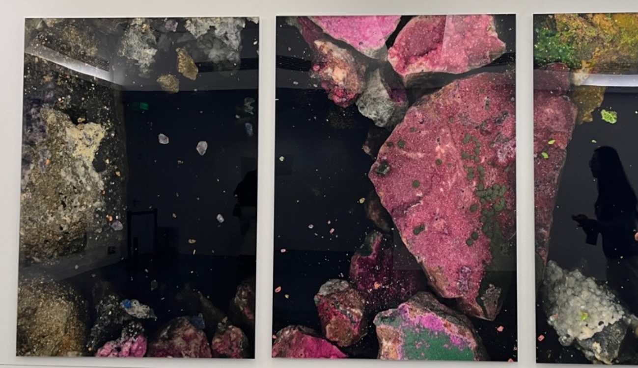 傅百林此次展览有两个系列的作品《玄林》(图1)和《潜影》(图2、图3)。《玄林》系列作品通过水墨和影像的统一,运用手工染色工艺和恰当的黑色元素,创作出层次丰富、有独特艺术张力的艺术作品。《潜影》系列作品共三件,创作灵感来自19世纪的动画装置“凯撒全景画”,并糅合了“树洞”、“取景框”和“幻灯片”的元素将摄影作品变成一组装置艺术,为观众营造一种身临其境的丛林体验。高郁韬是一位青年摄影师,这次展览中他展出了两组摄影作品和一组影像创作。摄影作品《春》(图4)和《夏夜》是他关于洞穴作品中的两组。这两组作品是将巴掌大的作品放大到约两米的尺寸,画面是将矿石进行组合,放在扫描仪上得到的。佛家有句话“芥子须弥”,就是指一个小小的“芥子”里面可以藏一座大山。毕加索说过:“艺术是一个谎言,但却是一个说真话的谎言。”艺术家以自然材料为媒介,以相机为媒介创造了不一样的可能,创造“虚假的视觉效果”。前期寻找适合的物质媒介,用影像方式记录。摄影在此作为视觉意境生成的媒介,与跨媒介整合的艺术更侧重呈现自然物质的抽象化与象征性。